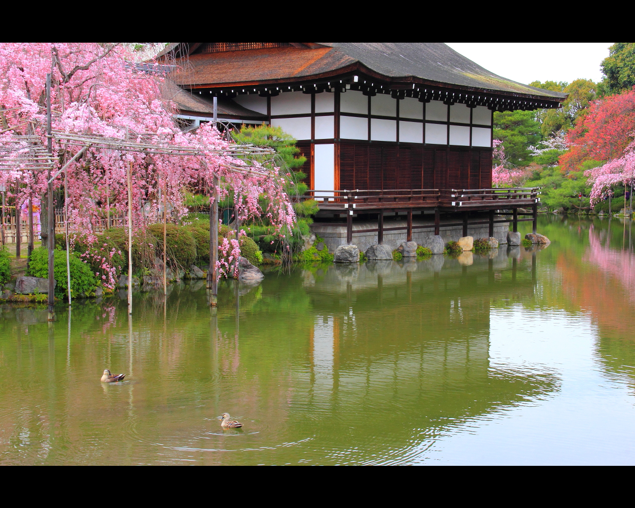 桜と鴨と湖