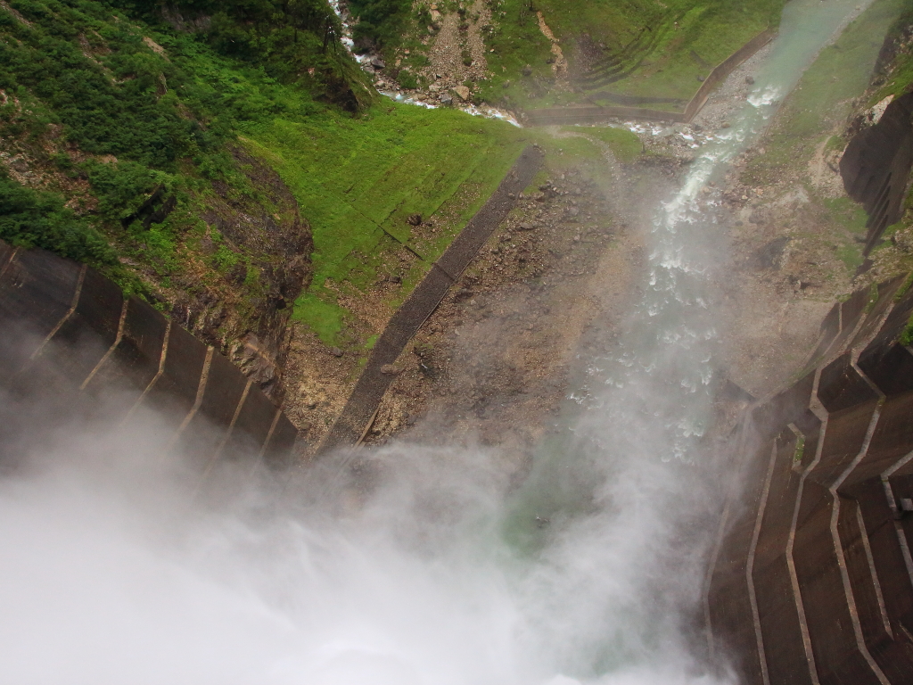 ダムの放水を真上...